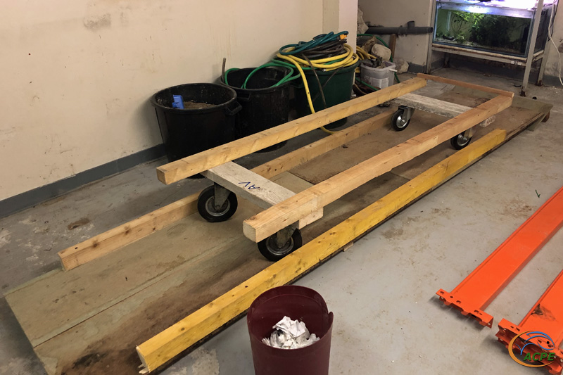 S’il y a près de 20 ans, nous avions descendu les aquariums à la mains, les remonter ne sera pas une mince affaire. Nous avons opté pour la réalisation d’une rampe, sur laquelle nous feront rouler un chariot, lentement tiré par un véhicule. Grace à ce système, nous pourrons extraire les aquariums et éléments lourds en ménageant le dos des bénévoles. La rampe a été réalisée le 19 août et le chariot un mois plus tard.